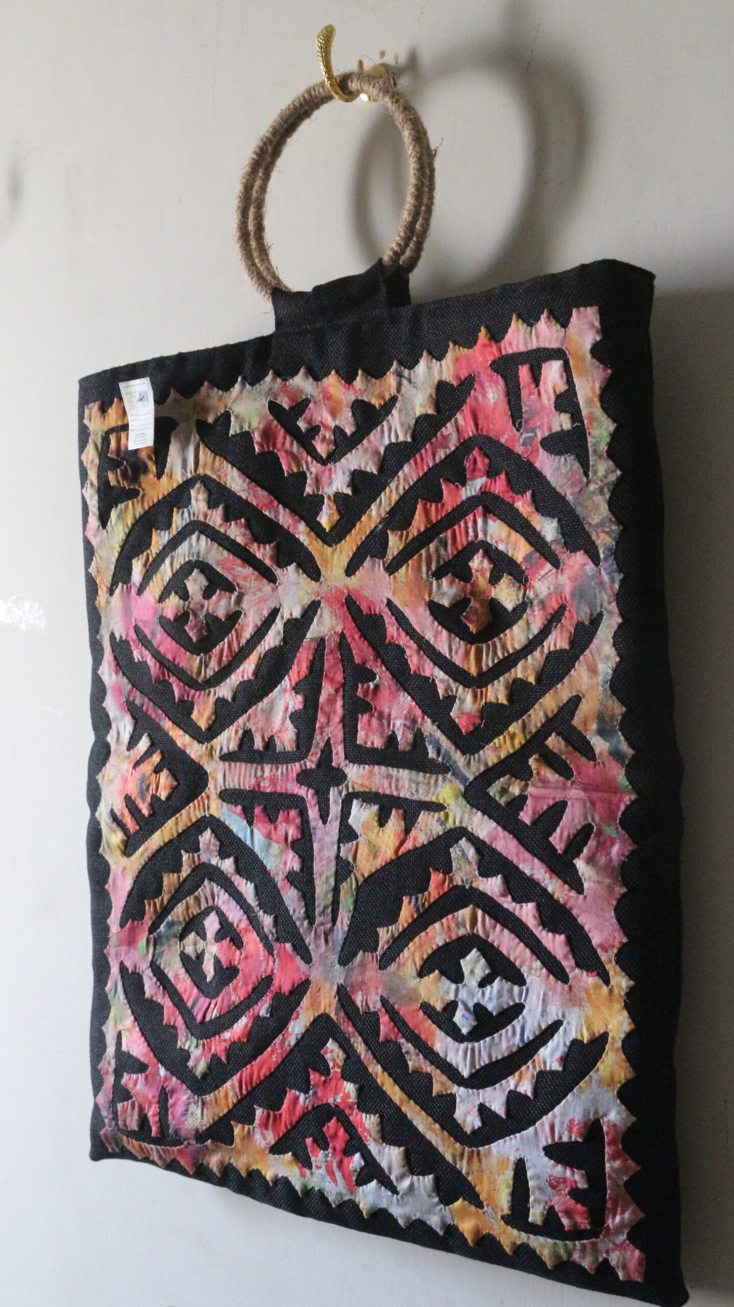 A vibrant explosion of color on black, this jute tote bag is a statement piece. Perfect for carrying all your treasures. ✨ #handmade